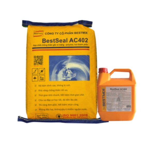 - BestSeal AC402 là hợp chất chống thấm, trám bít, hai thành phần, sau khi tác dụng thì tạo thành hỗn hợp composite silicat có độ cứng, độ dai và độ bám dính tối ưu, đặc biệt là không bị lão hóa theo thời gian.