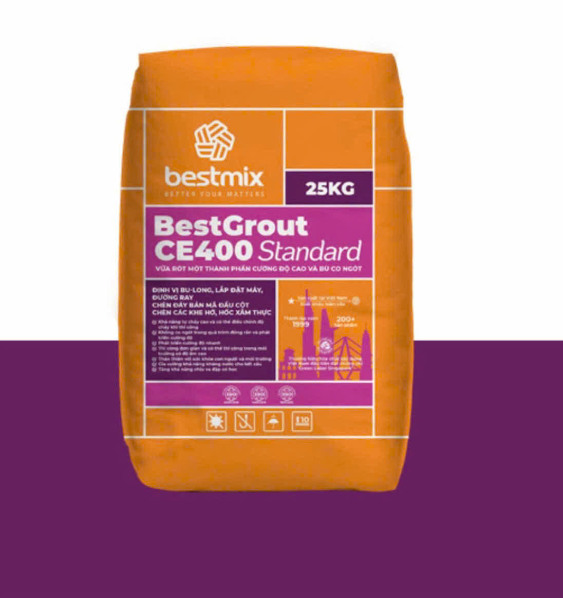 - Bột BestGrout CE400 được thêm từ từ vào lượng nước trộn đã được định lượng trước để đạt độ linh động (độ sệt) cần thiết cho quá trình thi công. Thông thường, lượng nước trộn tối ưu là 13% so với trọng lượng bột (3.25 lít nước cho một bao 25 kg). Dùng máy trộn cánh khuấy có tốc độ 500-600 vòng/phút để trộn hỗn hợp cho đến khi đạt được độ đồng nhất theo yêu cầu thi công (khoảng 3 phút).